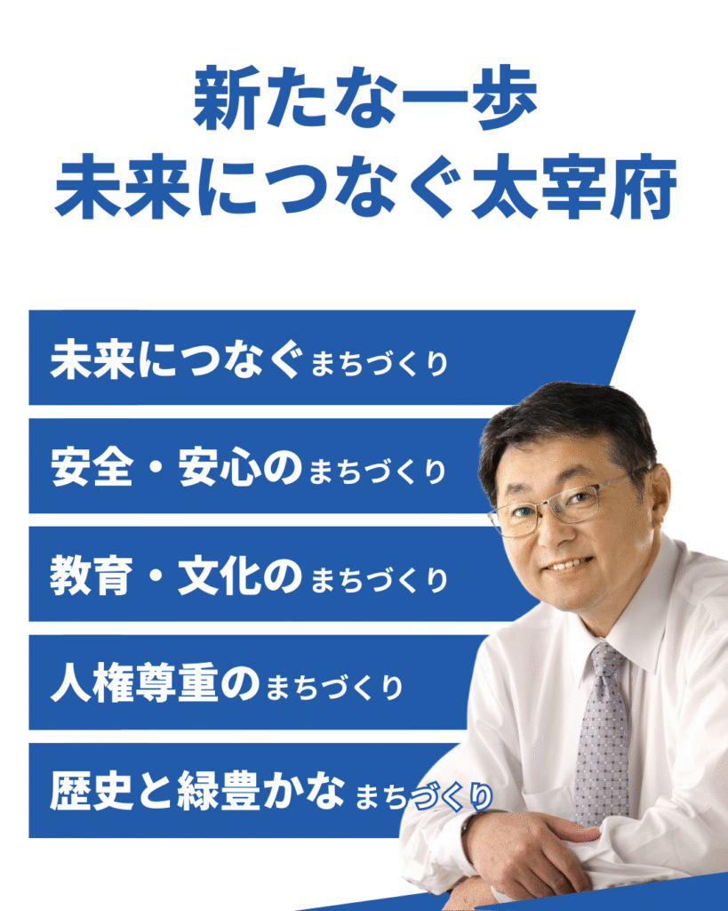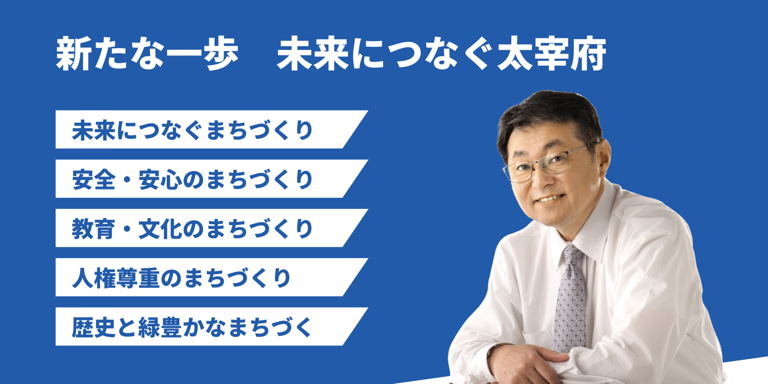 これまでの経験を活かし、歴史と緑豊かな太宰府市のさらなる発展と安全で安心して暮せる街づくりに一生懸命取り組んでまいりますので、どうか皆さまのご支援ご協力を賜りますようお願い申し上げます。
